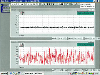 | < 結 果> エアサスを使用することにより、12G以上→1.2G荷物に加わる振動の90%以上を吸収する。 |